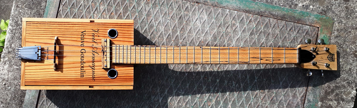 It is tuned in open G (GDGB), probably the best known tuning for the 4-string cigar box guitar and equipped with a custom hand wound magnetic pick-up.